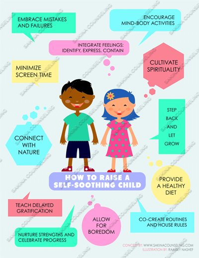 An illustration showing the critical areas a parent can focus on to nurture a child's ability to self-soothe. 1 page - full color without the watermark.